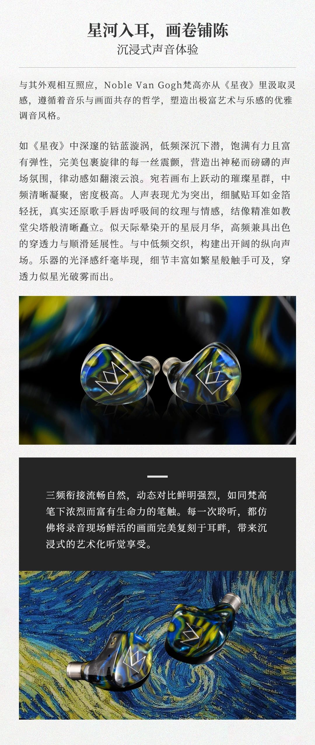 Van Gogh 梵高耳機(jī)以梵高名作《星夜》為靈感,將鳶尾藍(lán)腔體的粗糲油彩質(zhì)感與星空漩渦般的人體工學(xué)設(shè)計(jì)融合,打造可穿戴的藝術(shù)單品。聲學(xué)上采用 4 單元混合架構(gòu) ——8mm 雙磁路動(dòng)圈單元帶來如翻滾云浪的低頻律動(dòng),2 顆 Sonion 動(dòng)鐵單元精準(zhǔn)呈現(xiàn)中頻人聲的細(xì)膩情感,1 顆 Knowles 極高頻動(dòng)鐵單元演繹星光穿透薄霧般的高頻延展,三頻動(dòng)態(tài)對(duì)比鮮明如梵高筆觸,搭配 107dB 靈敏度與 29Ω 阻抗,手機(jī)直推即可釋放 20Hz-20kHz 全頻段鮮活聽感。星軌弧度腔體貼合耳廓,8 芯 OCC 單晶銅線材呼應(yīng)畫作元素,讓佩戴成為纏繞耳際的舒適星帶。
