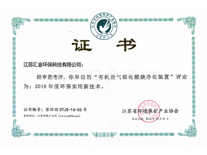 有機(jī)廢氣環(huán)保實(shí)用技術(shù)證書