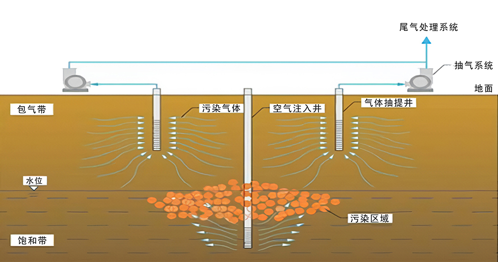 對土壤揮發(fā)性有機污染進行原位修復的一種方法,利用真空泵抽提產生負壓,強制新鮮空氣流經(jīng)污染區(qū)域,將揮發(fā)性有機物和半揮發(fā)性有機物從不飽和土壤中隨空氣抽取到地面進行收集和處理。主要應用于VOCs、燃料油的土壤污染,具有設備簡單,易于安裝操作,環(huán)境破壞小,修復時間短等特點。