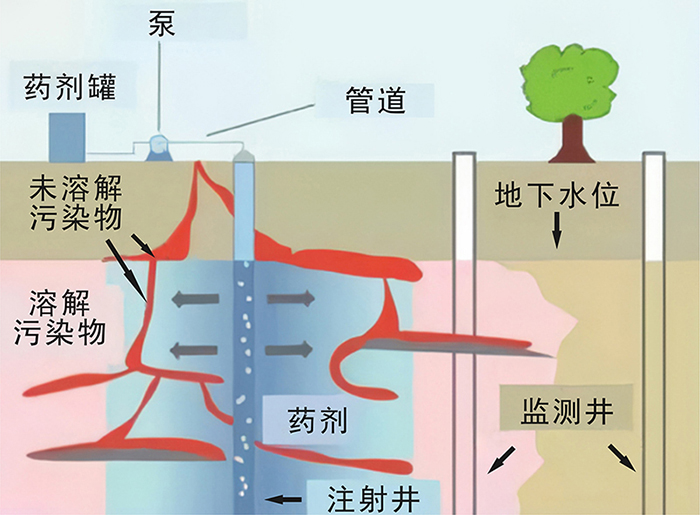 原位化學氧化/還原技術是通過向污染區(qū)域的土壤注入氧化劑或還原劑,通過氧化或還原作用,使土層中的污染物轉化為無